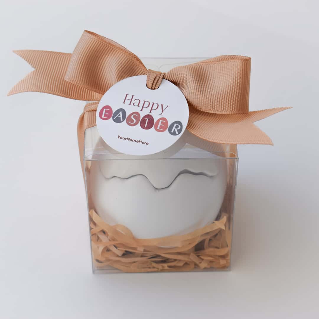 Exclusive Easter Gifts Unique Eggs Style Scented Candles. Each candle comes with a personalized tag adding a bespoke touch to your festivities, a ribbon, a nest of shredded brown paper in a plastic box.