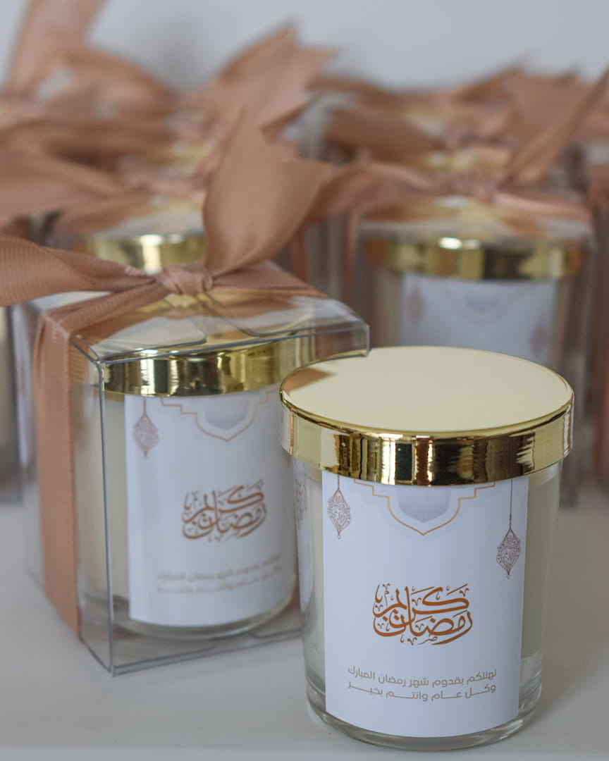 You can choose the ribbon and design colors and personalize the text on the candle with names, initials, and Ramadan Kareem greeting messages.